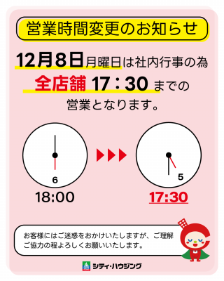 【12/8(月)臨時営業時間変更のお知らせ】